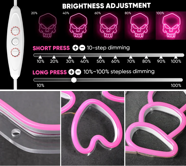 Dimmable:The neon sign comes with a dimmable button, so you can easily adjust the brightness with a quick press or a long press. This feature provides convenient control over the level of illumination.