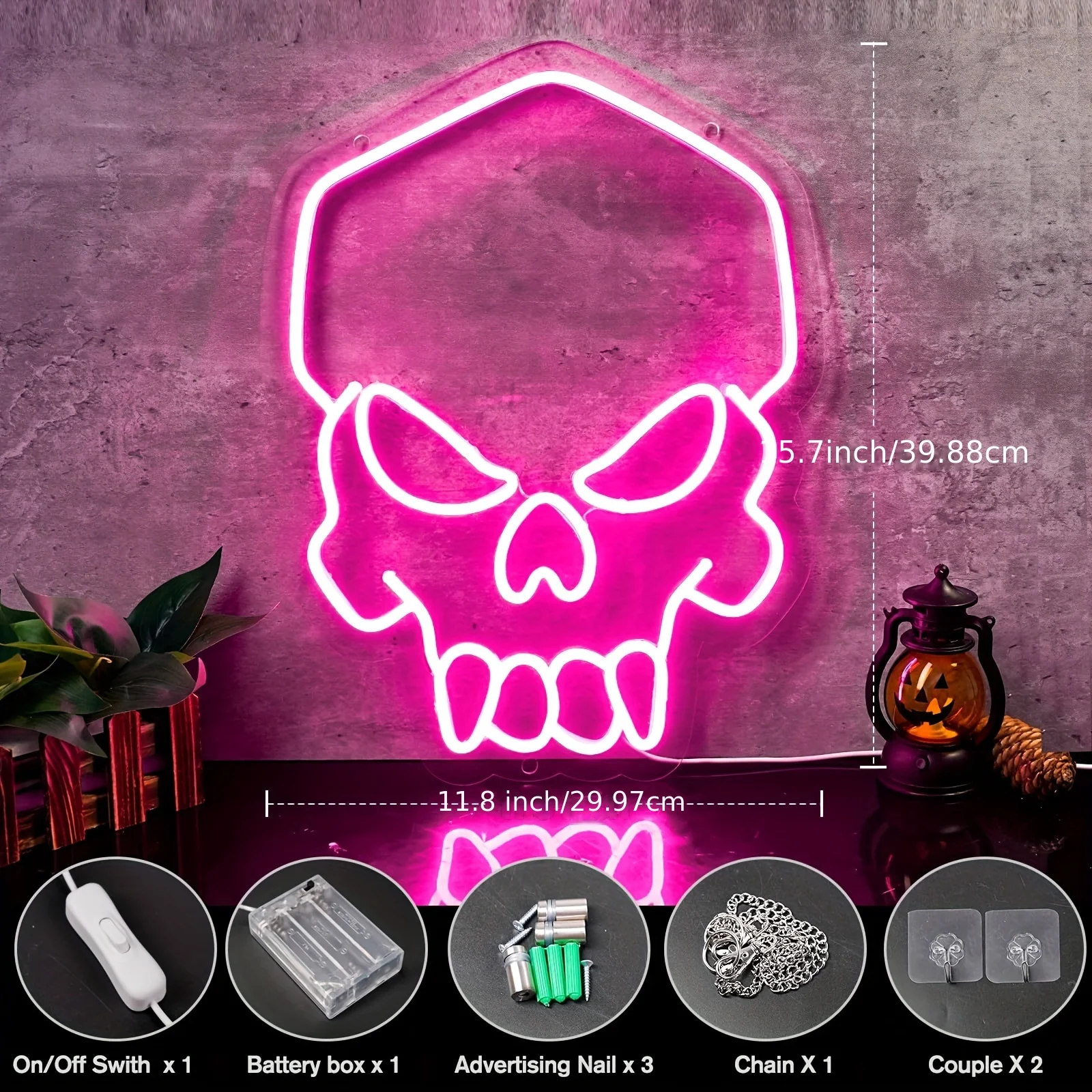 Halloween Skull Neon Sign Decoration: The neon light is in the shape of a skull,pink skull neon sign is made by flexible silicon LED strip lights and fixed on an acrylic clear board